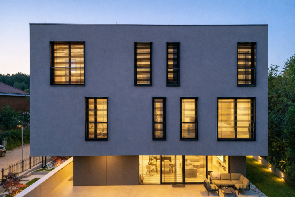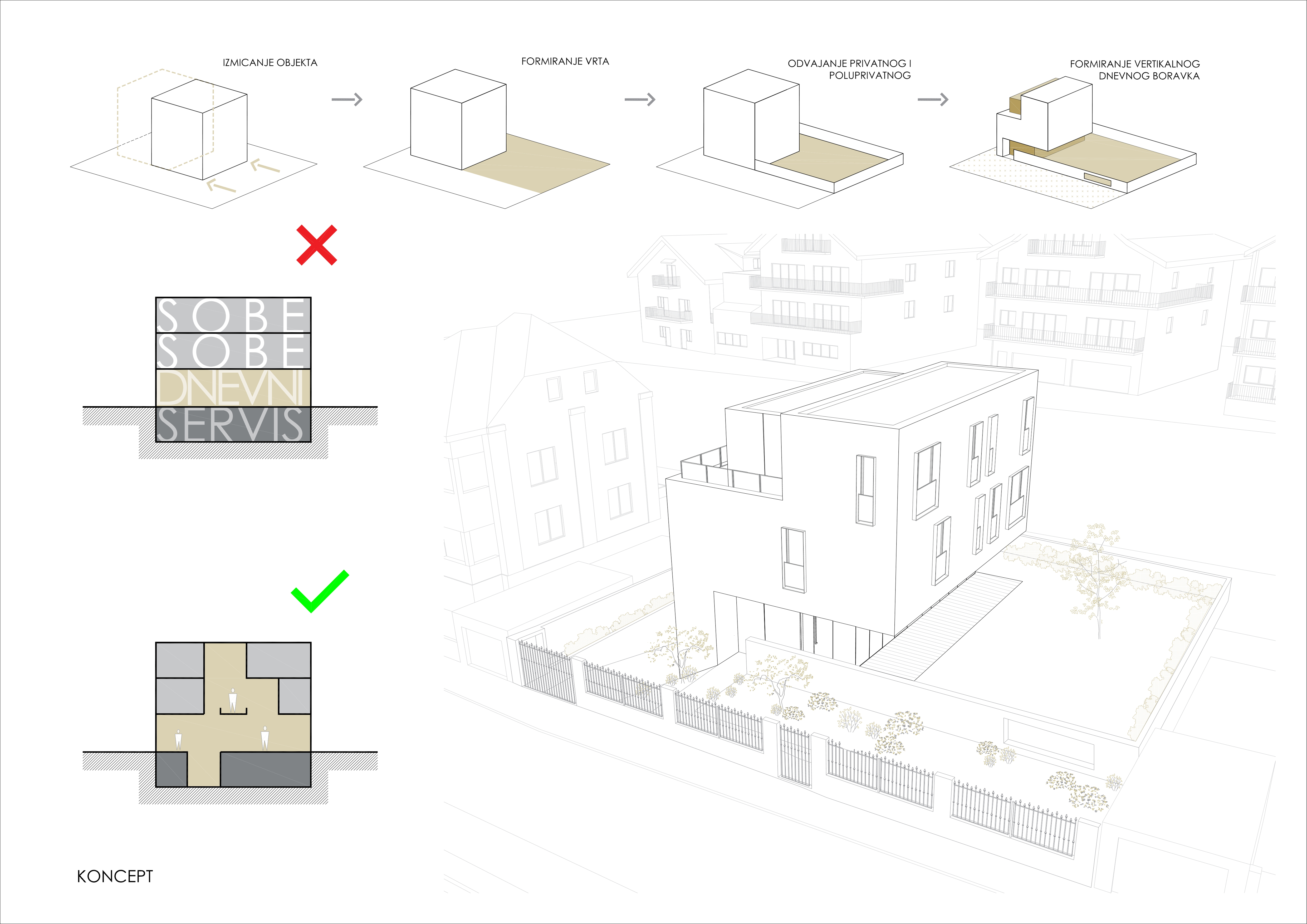 Radićevo Promenade Urban House is conceived through a dialogue with its immediate context and within a strictly defined planning and conservation framework. The volume is set back as far north as possible relative to the existing house, freeing the southern portion of the plot and forming an enclosed garden as the primary outdoor living space.