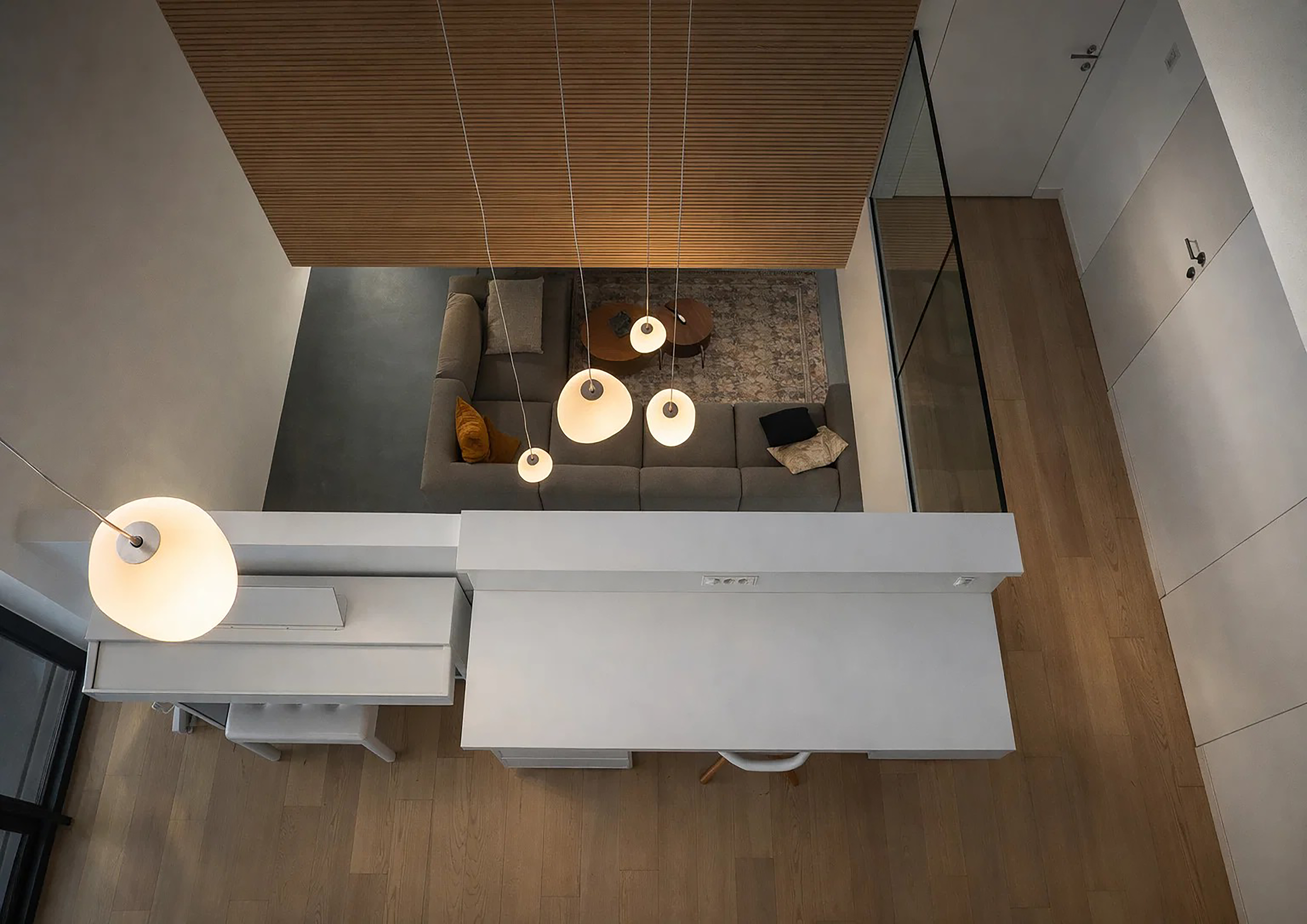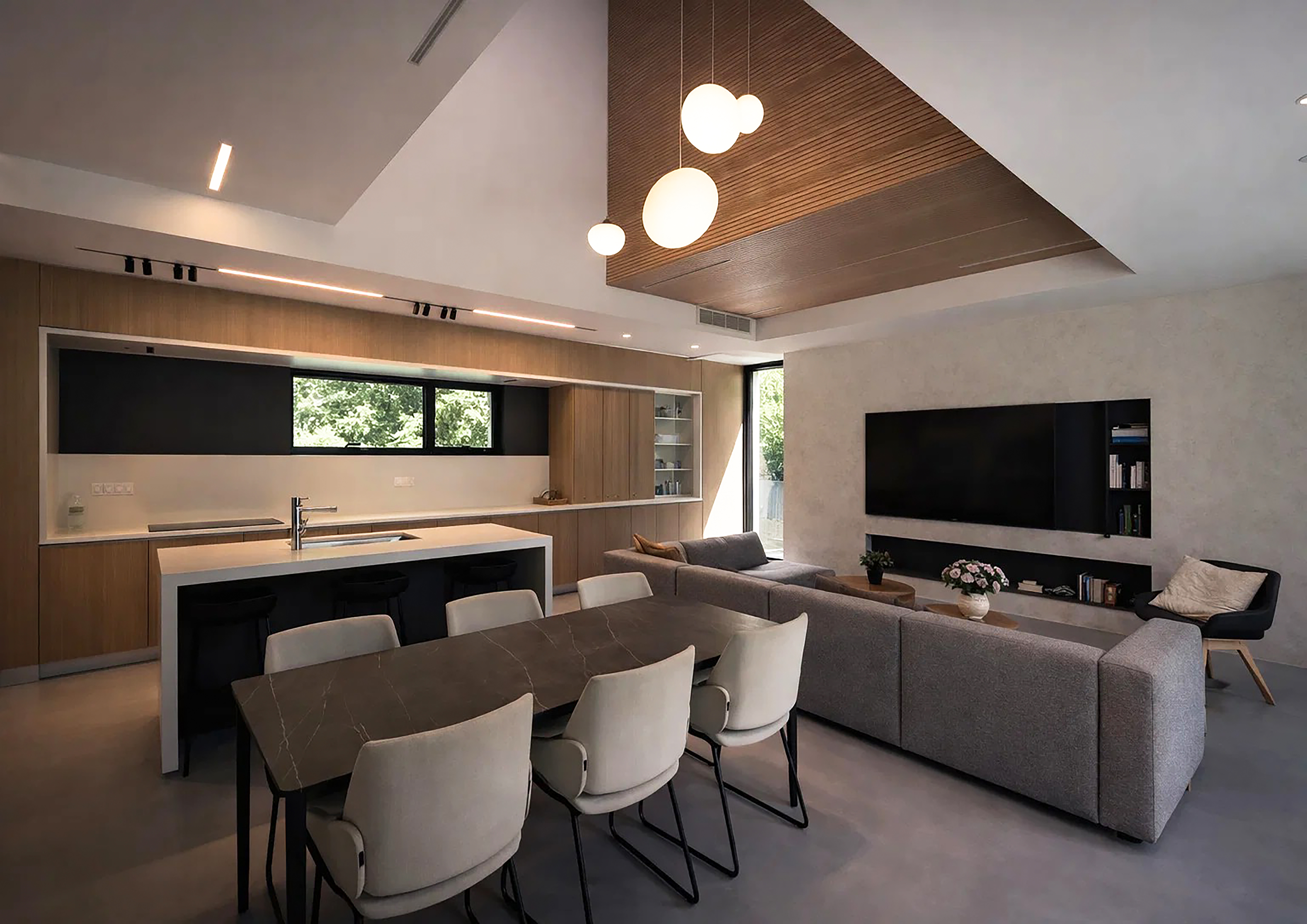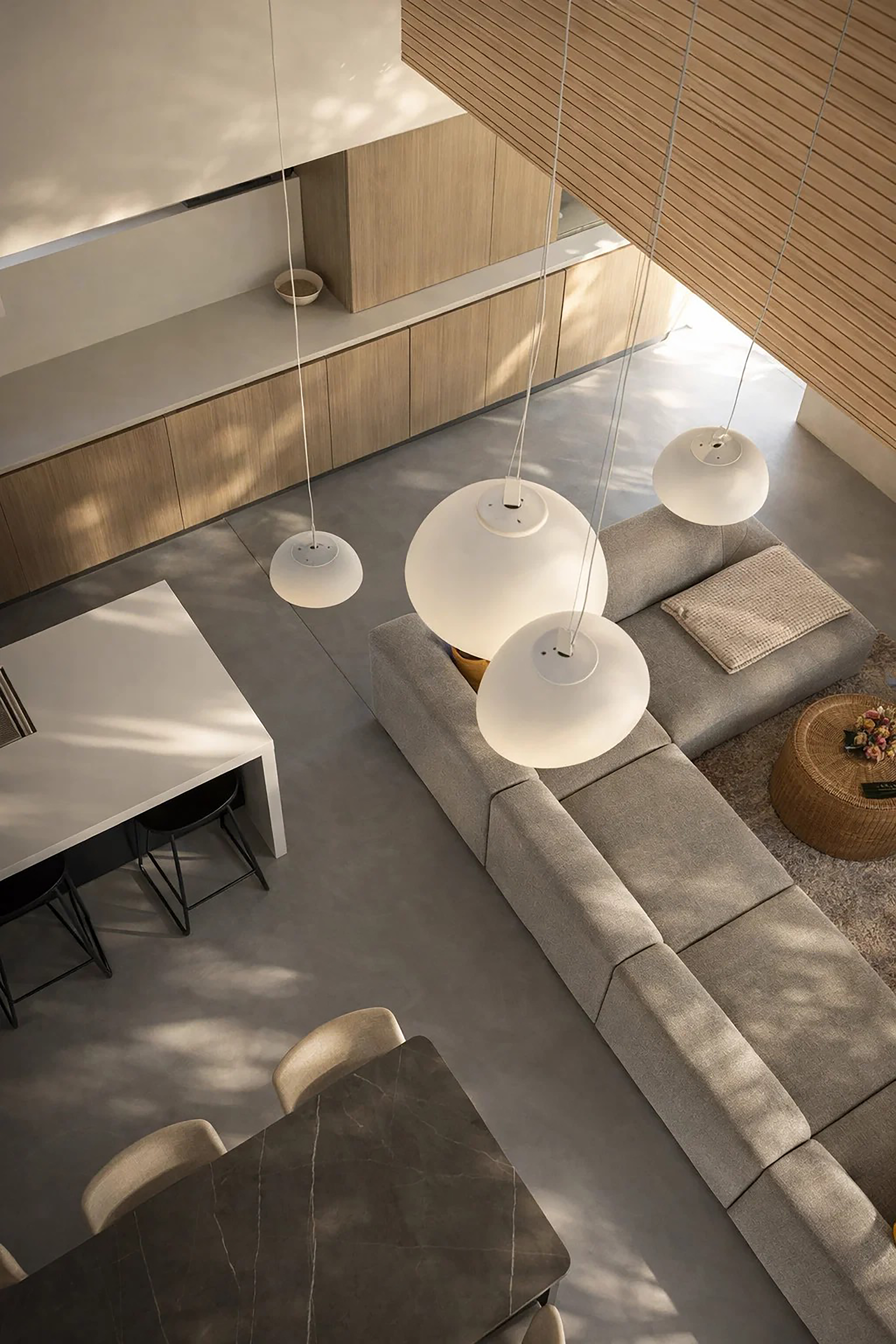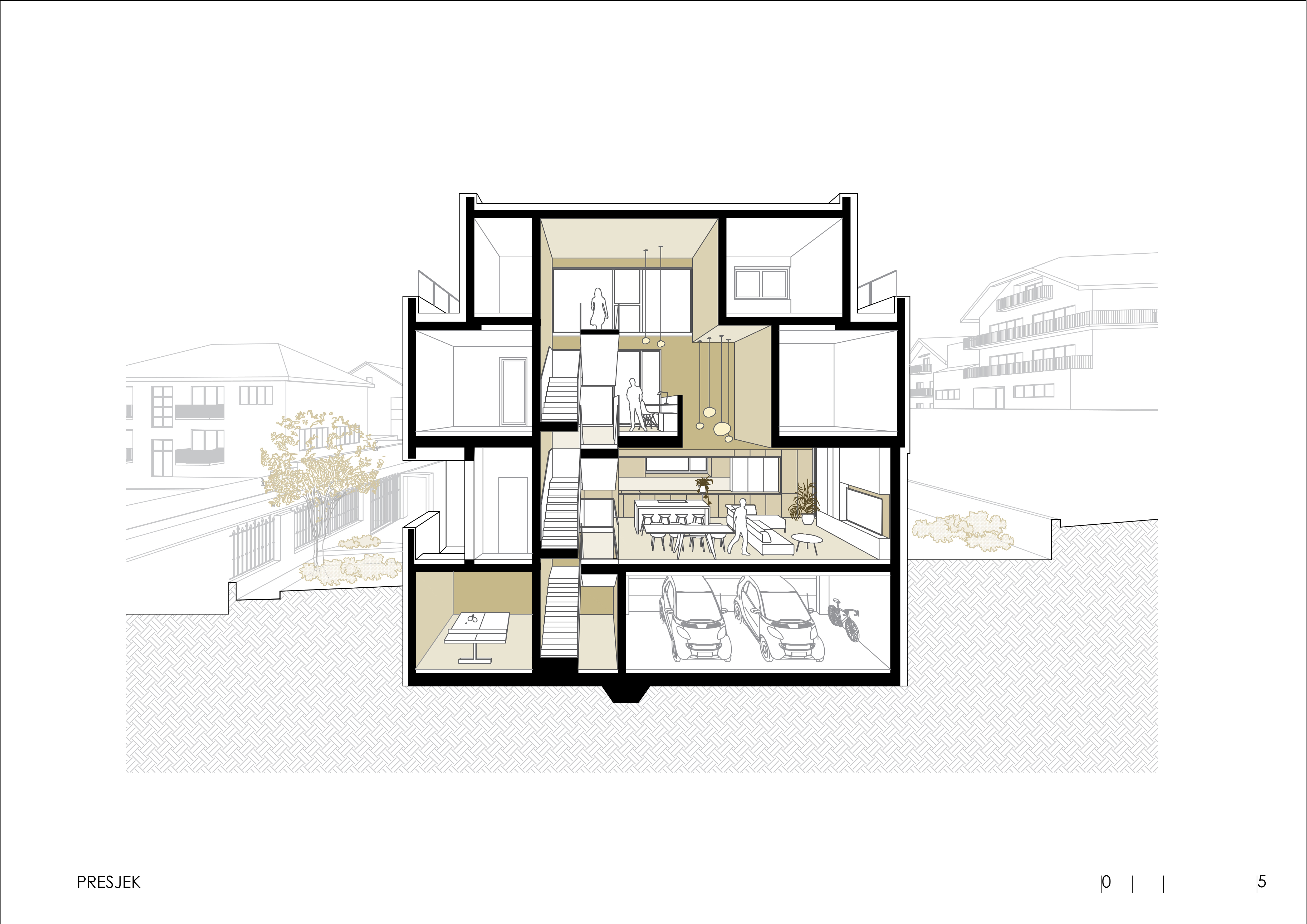 The fundamental design challenge lay in accommodating a home for a six member family within a volume constrained by regulations, balancing a generous shared living space, individual rooms for children, dedicated workspaces for the parents, and additional programmatic requirements. The tension between a compact footprint and a complex brief is resolved through vertical organization and the formation of a three level central living volume. The ground floor living room acts as the social core, while the staircase and galleries connect the levels into a continuous spatial dialogue. The basement accommodates utilitarian and social functions.