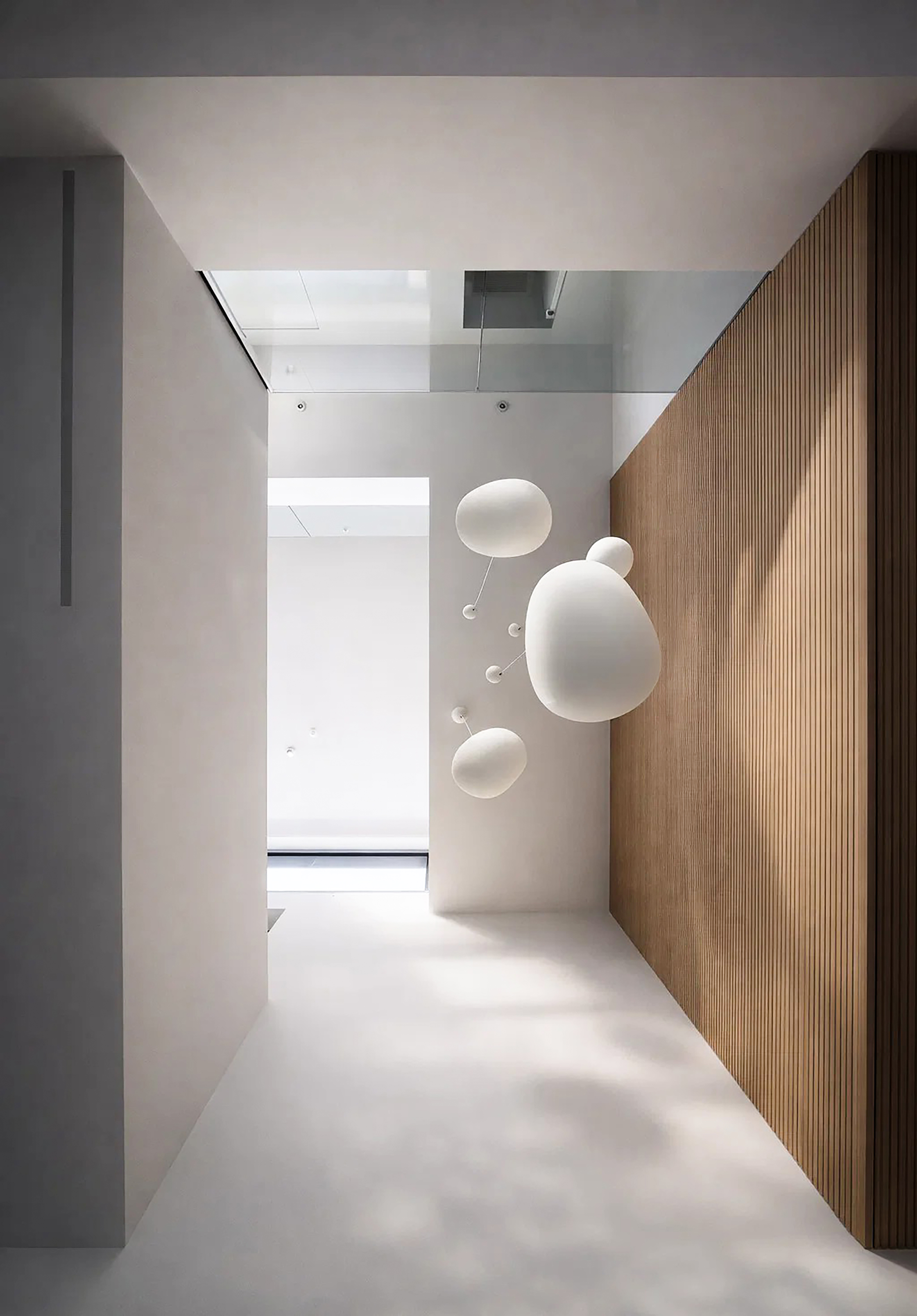 The interior is defined by the sculptural treatment of the staircase rising through a central void, clean lines, and a palette of warm materials that emphasize spatial depth and continuity. The exterior responds in a disciplined manner to the promenade context, reinterpreting the existing condition through tone and materiality while maintaining the continuity of the street frontage.